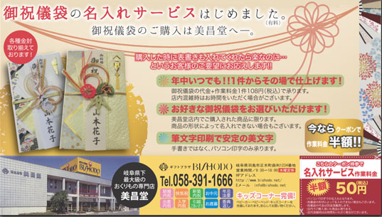 羽島贈答 美昌堂 羽島市正木町曲利1234 TEL (058)391-1666 FAX (058)391-1677